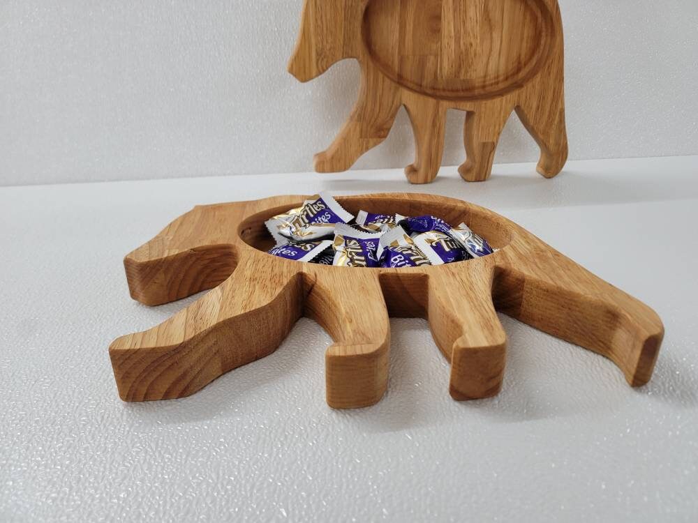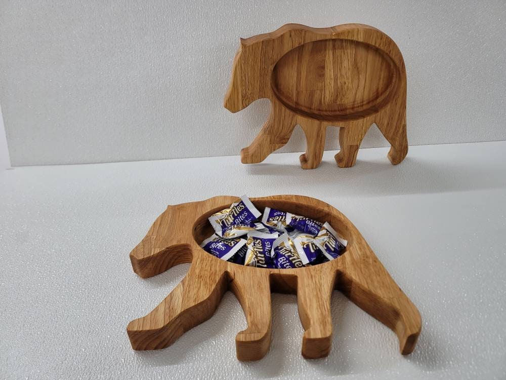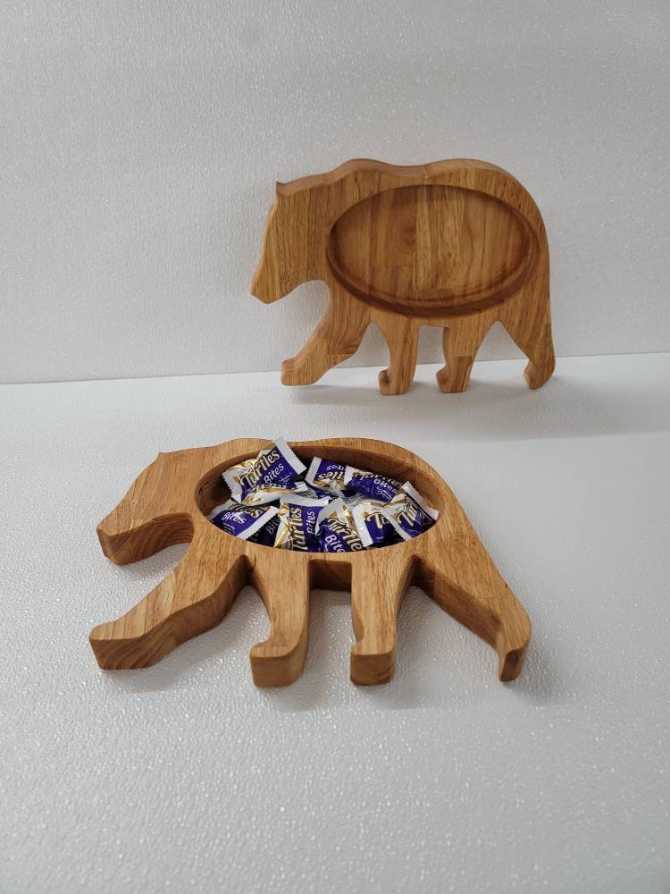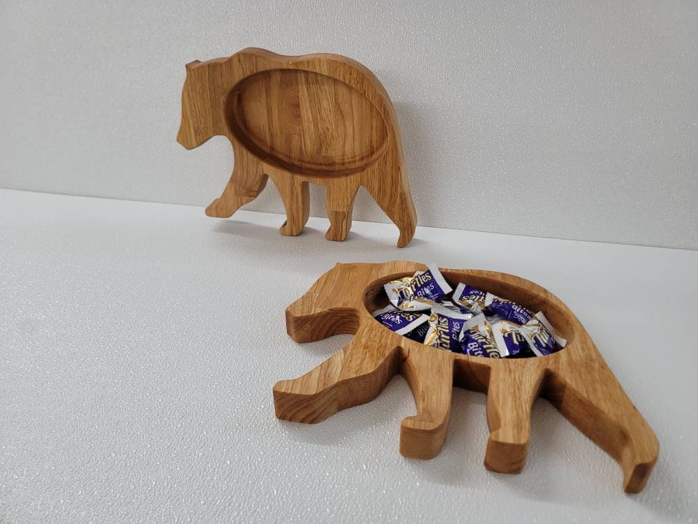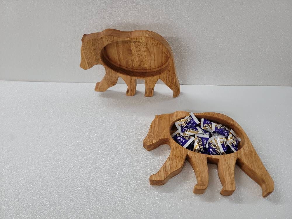 These hardwood snack dishes shaped like a bear are great for any occasion. Snacks, treats, catch-all, all kinds of uses. There are finished can I butcher block conditioner that is food safe for all of your snacks . These are solid hardwood.