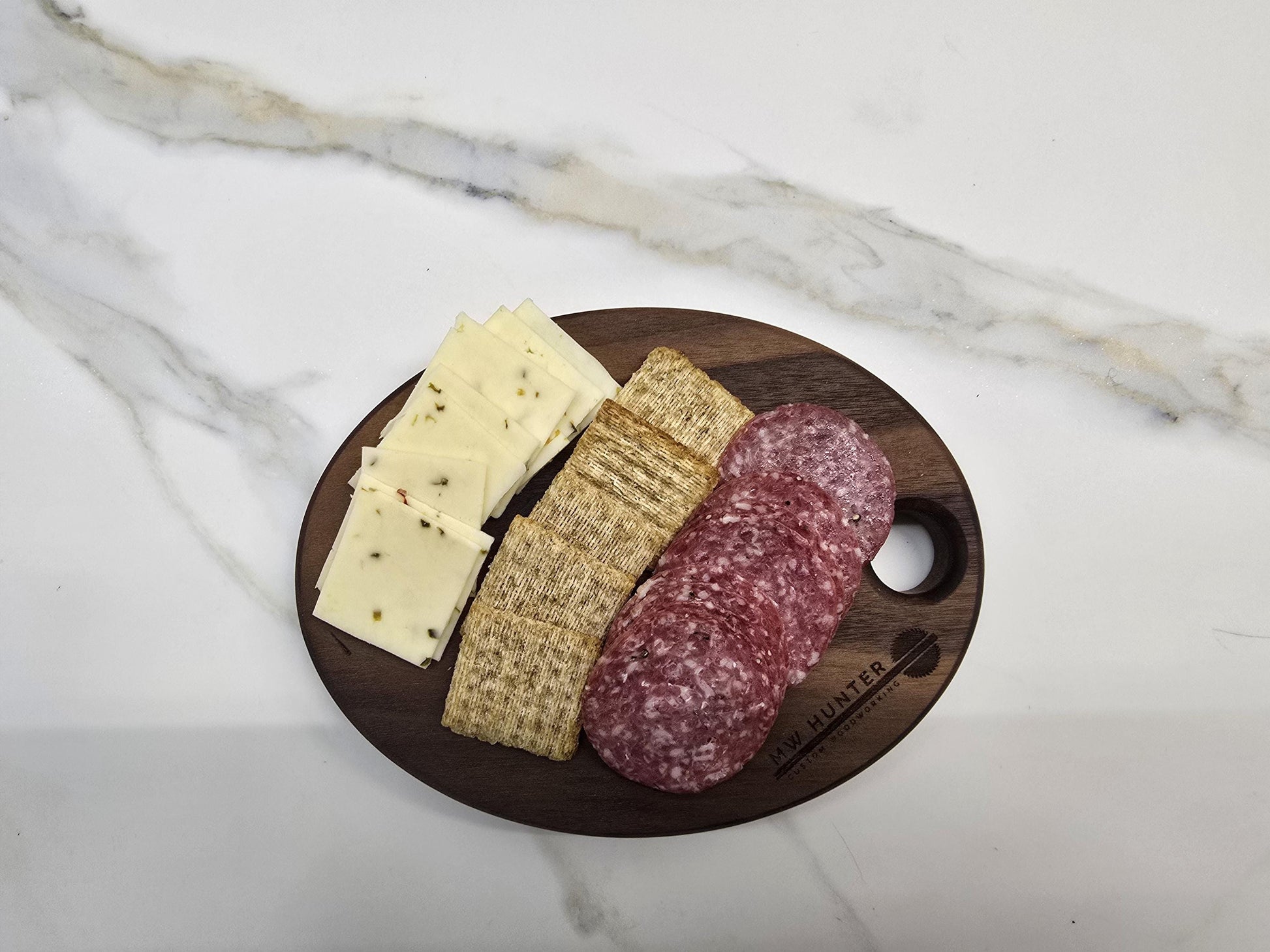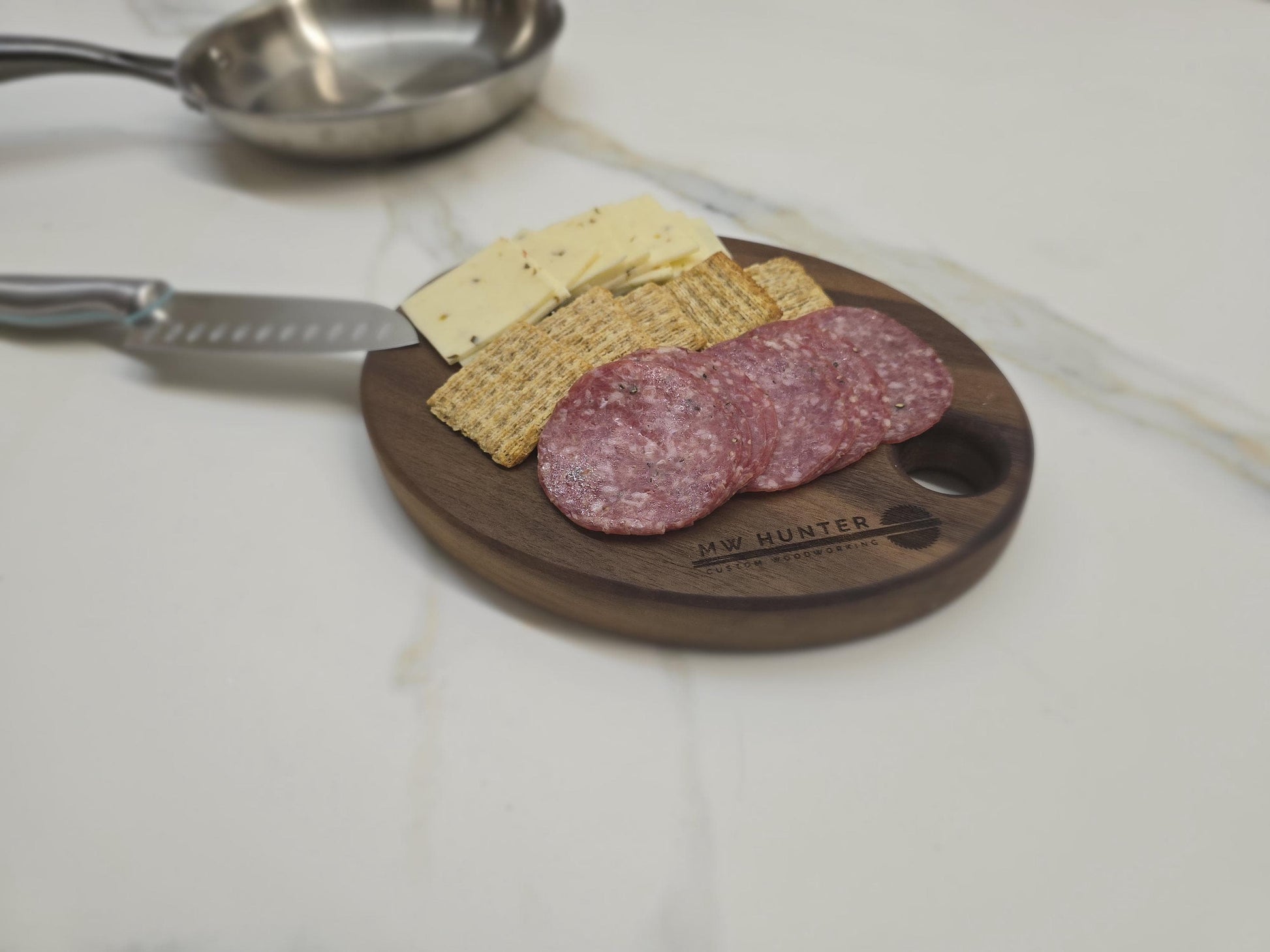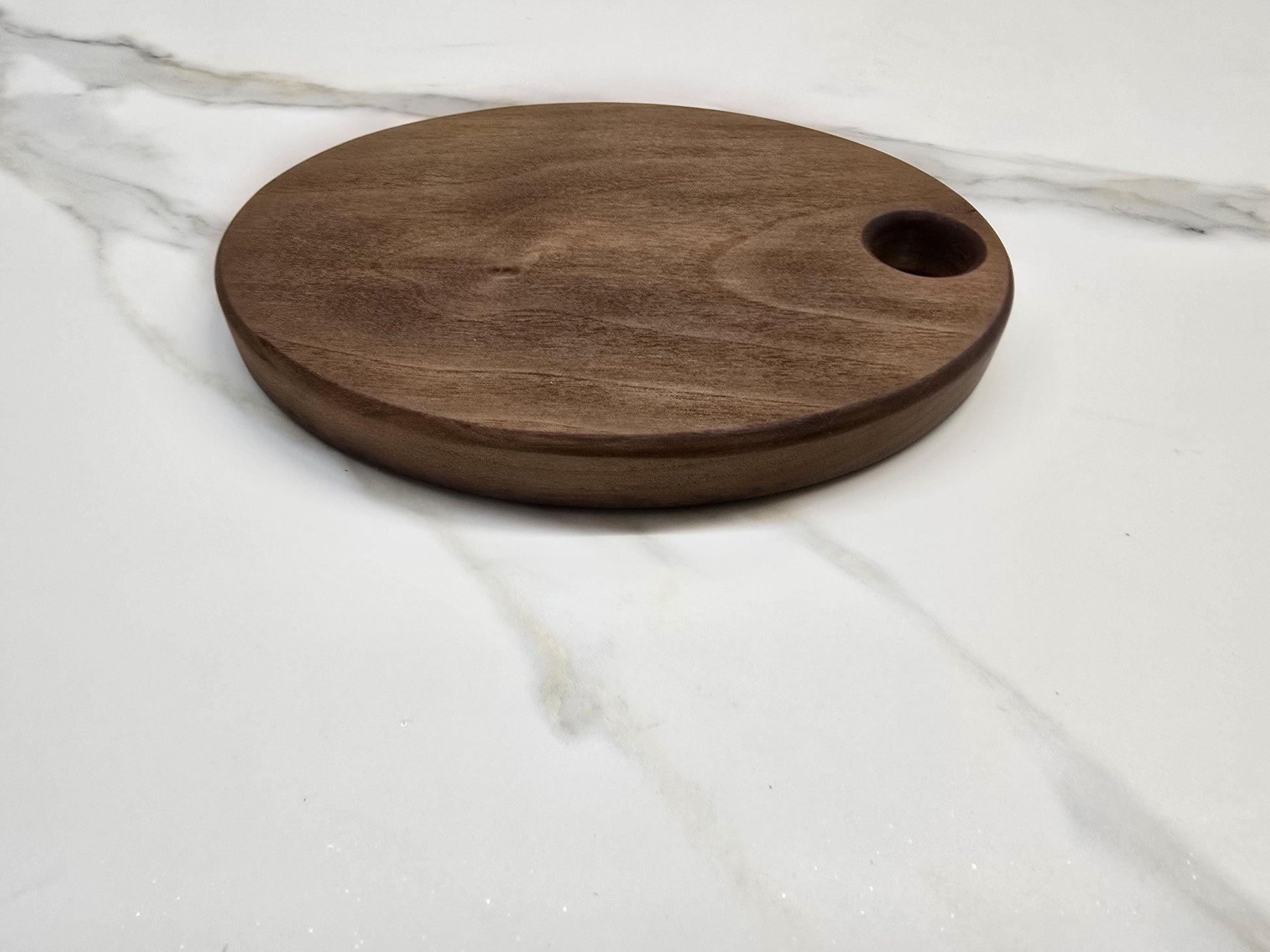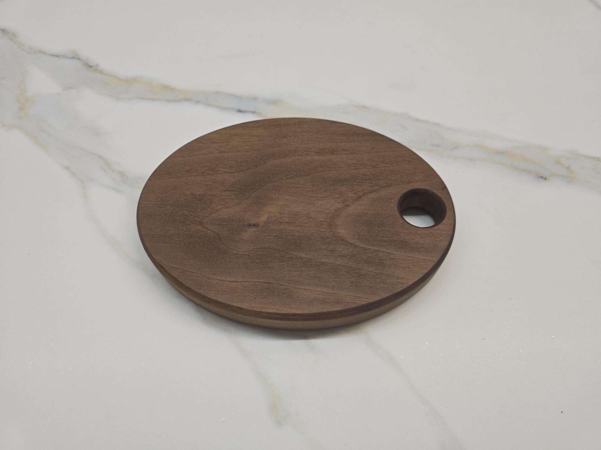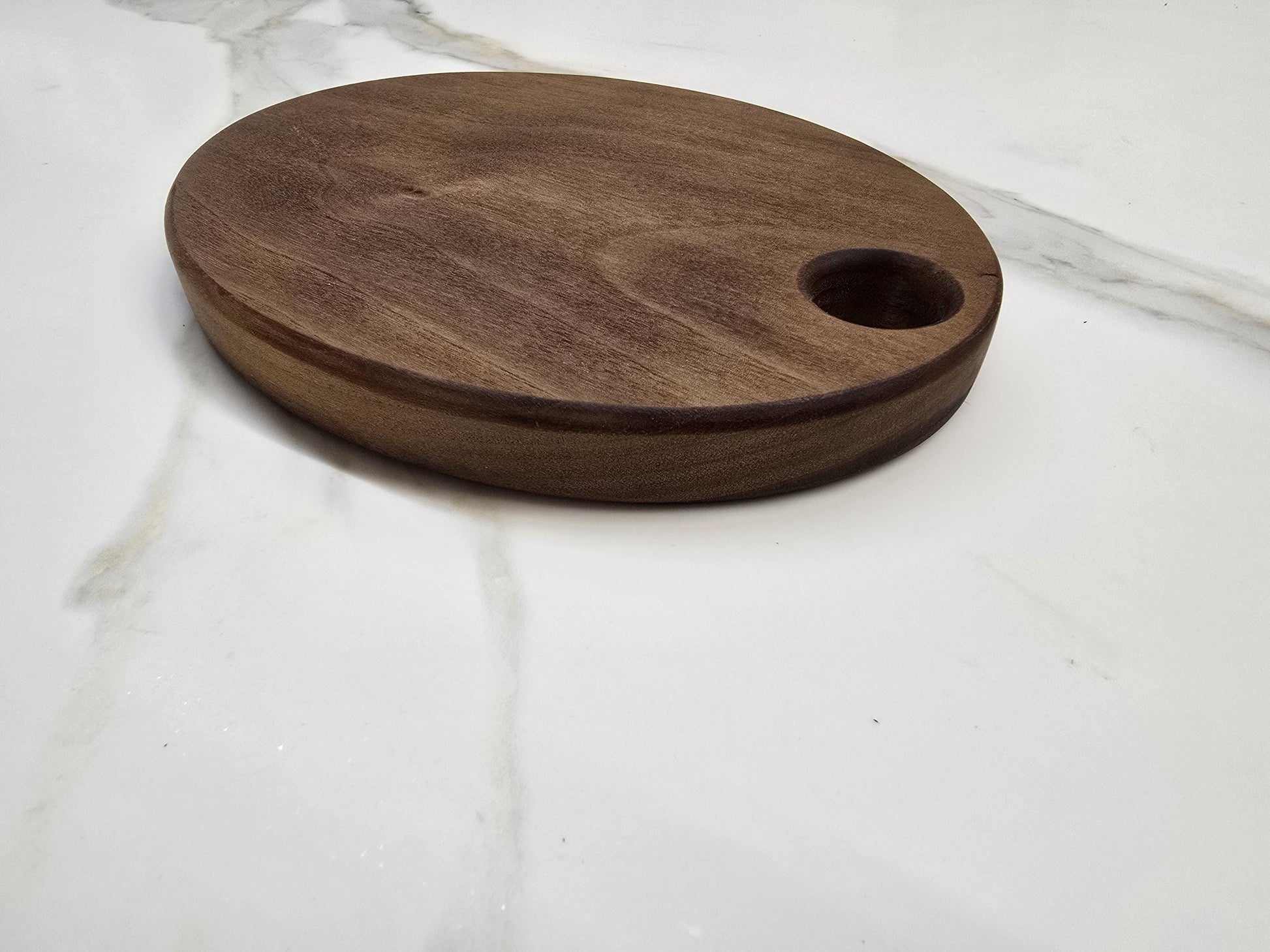This small cutting/serving board is perfect fit for kitchens. It can be hung or easily fit in a drawer. Solid black walnut.