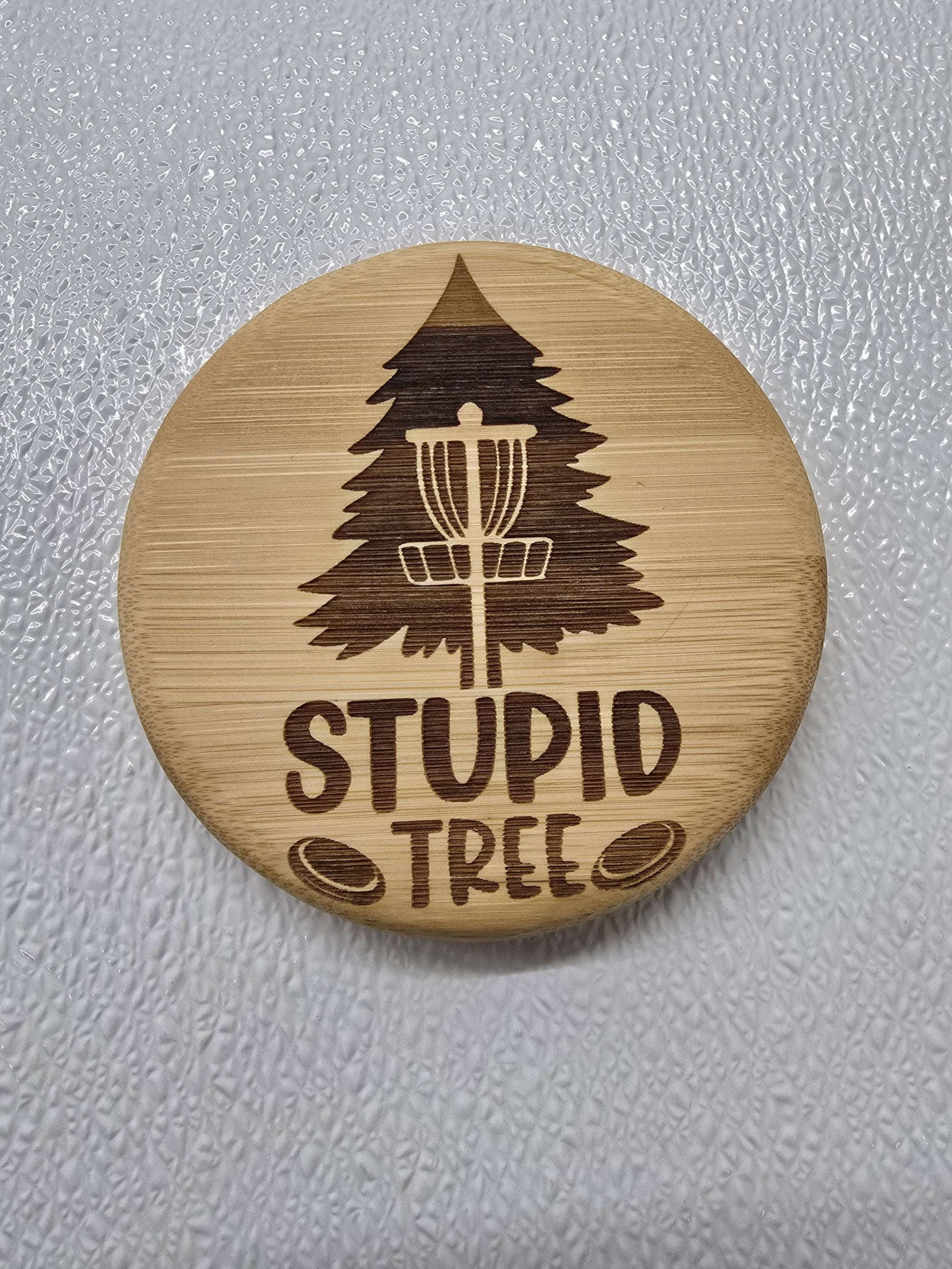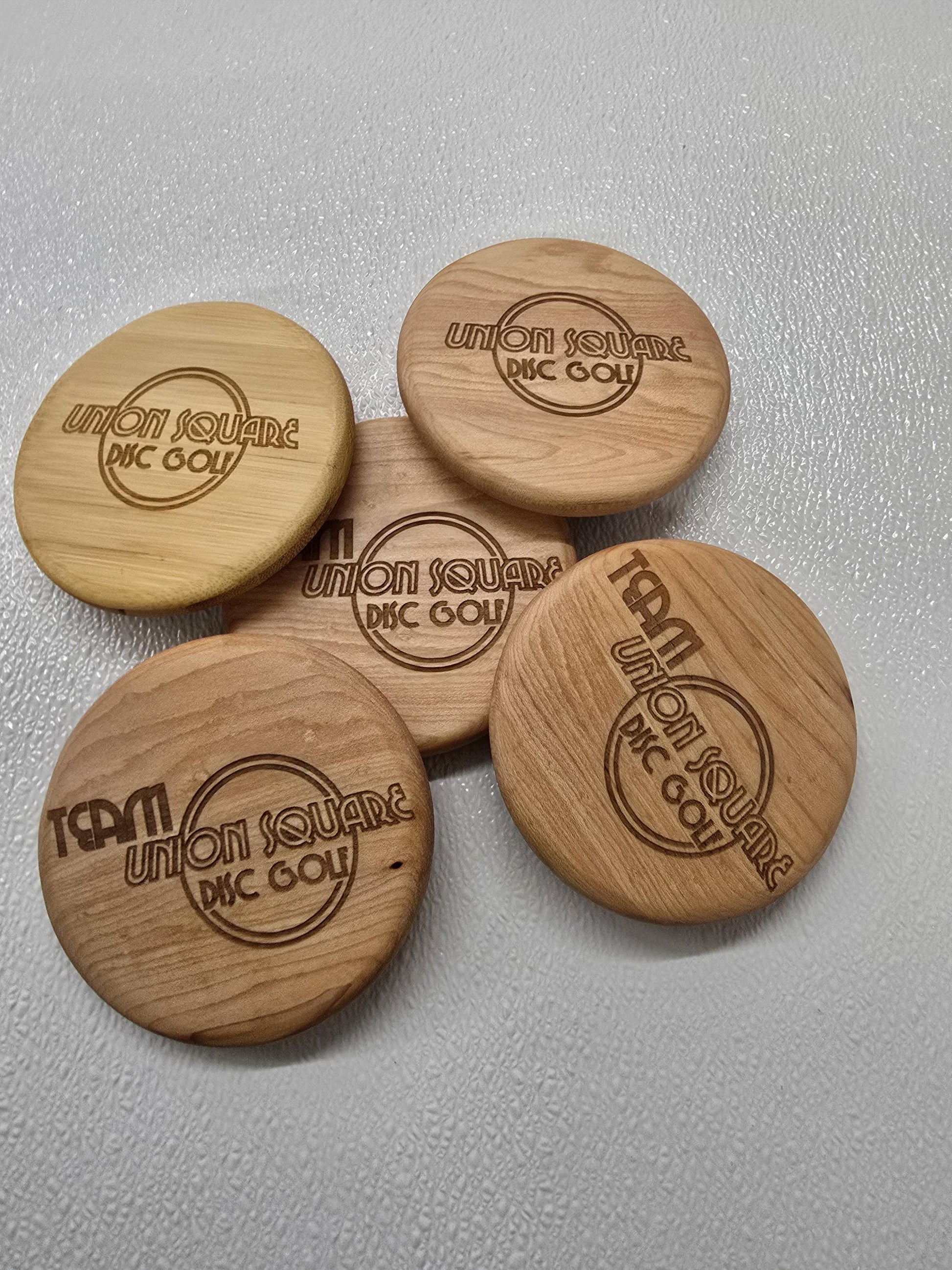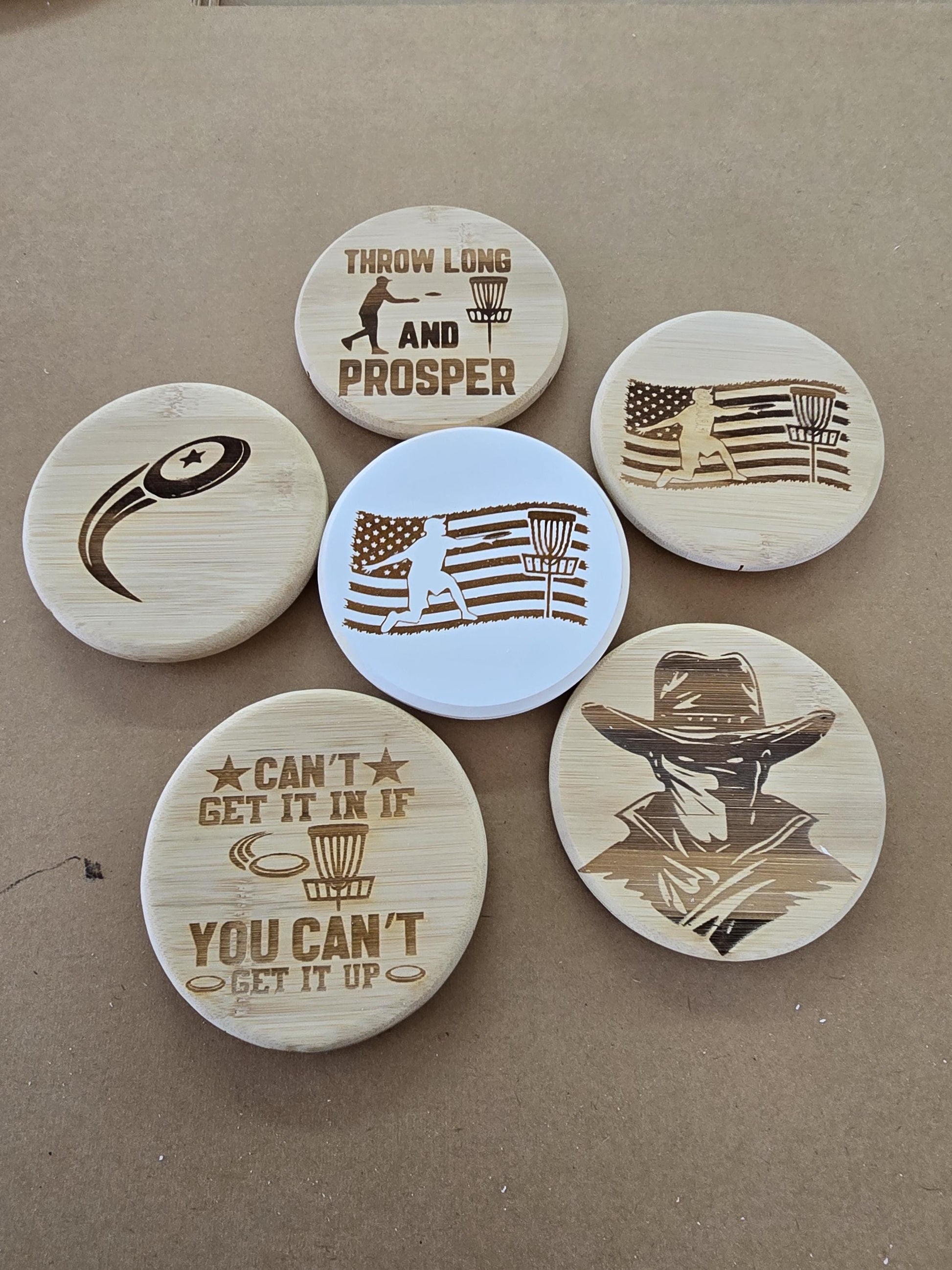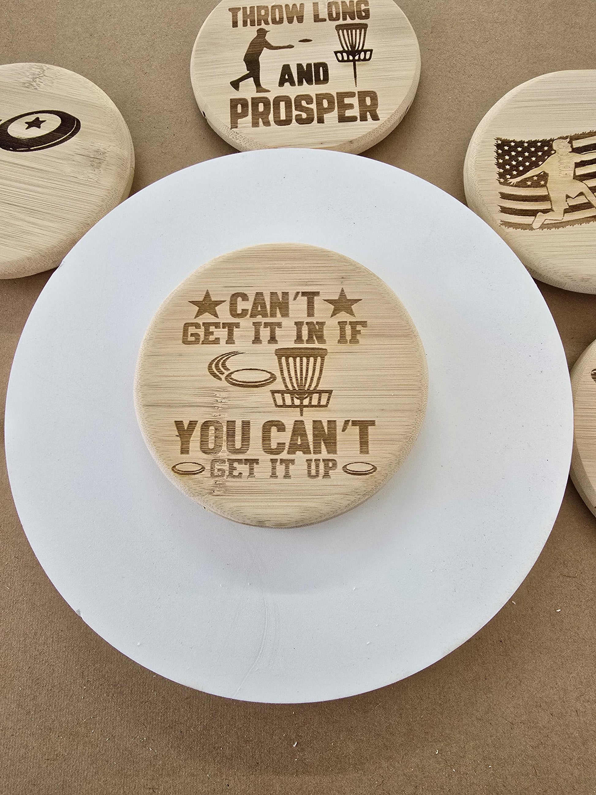 These are custom made in your choice of material, 5" in round 5/8" thick . Custom logos, characters, sayings, businesses, and more can be lazered on the front.