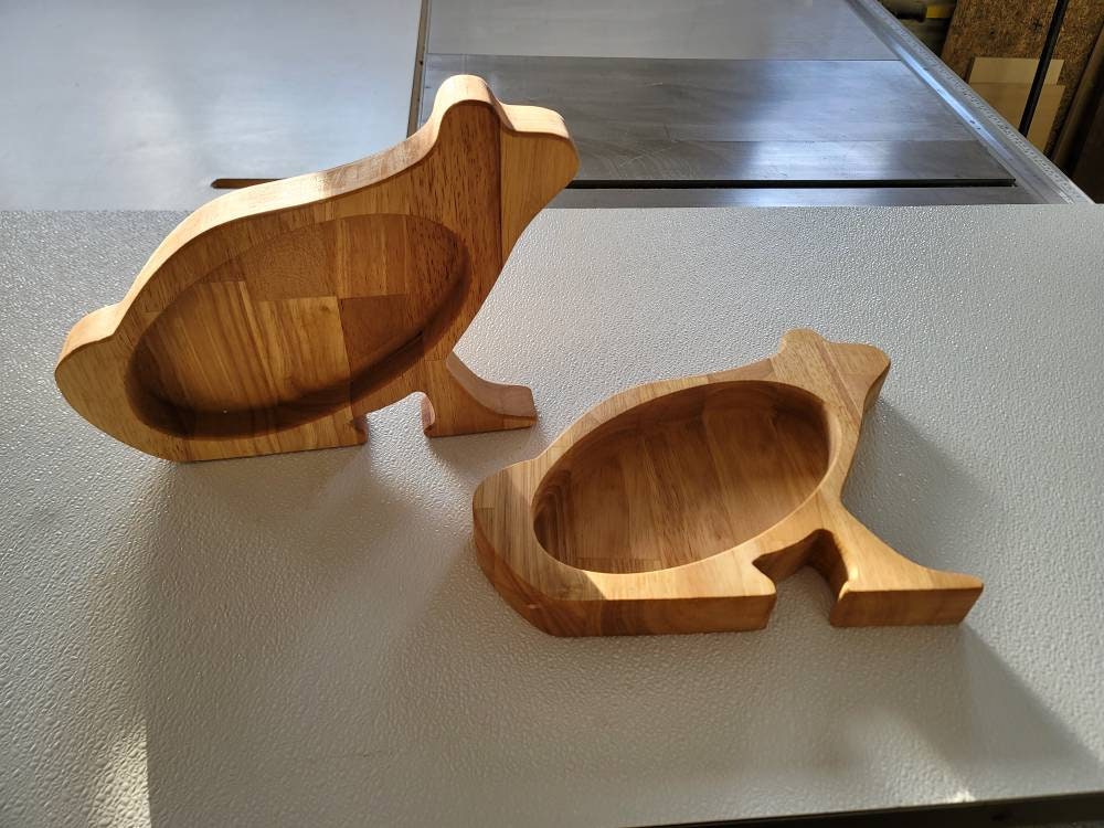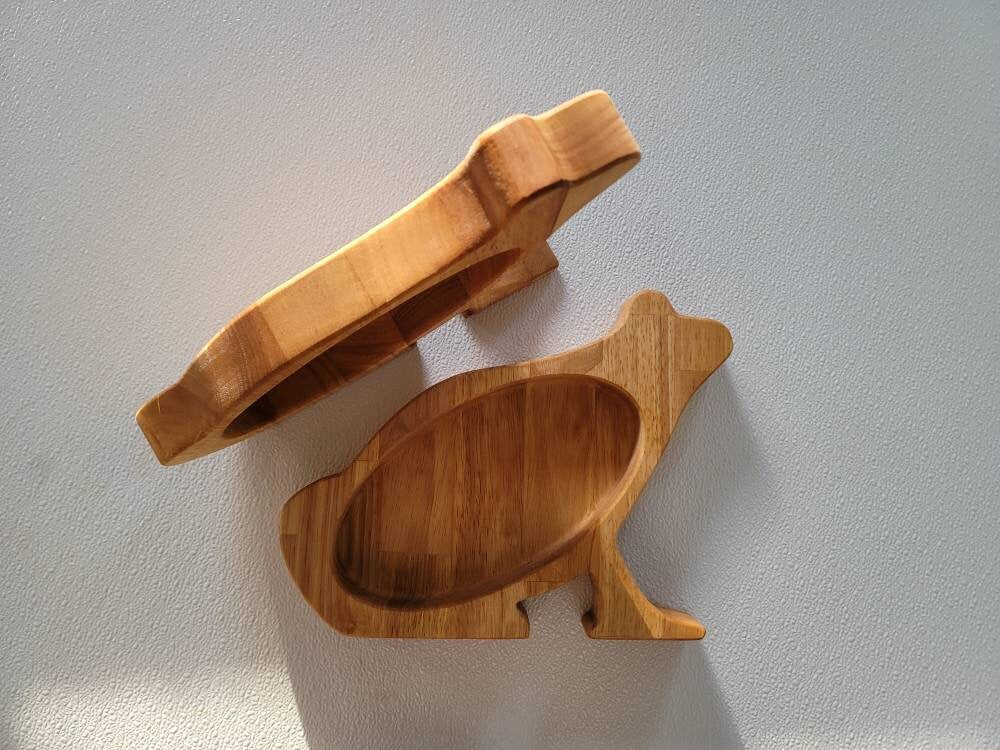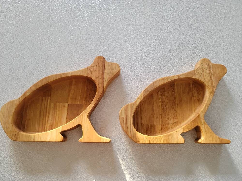 These hardwood snack dishes shaped like a frog are great for any occasion. Snacks, treats, catch-all, all kinds of uses. There are finished can I butcher block conditioner that is food safe for all of your snacks . These are solid hardwood. Sold individually 9.75" Tall 12.5" Wide 1.5" Thick More varieties available.