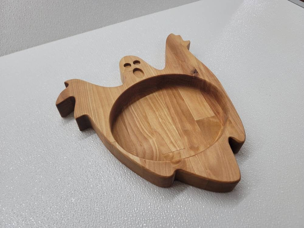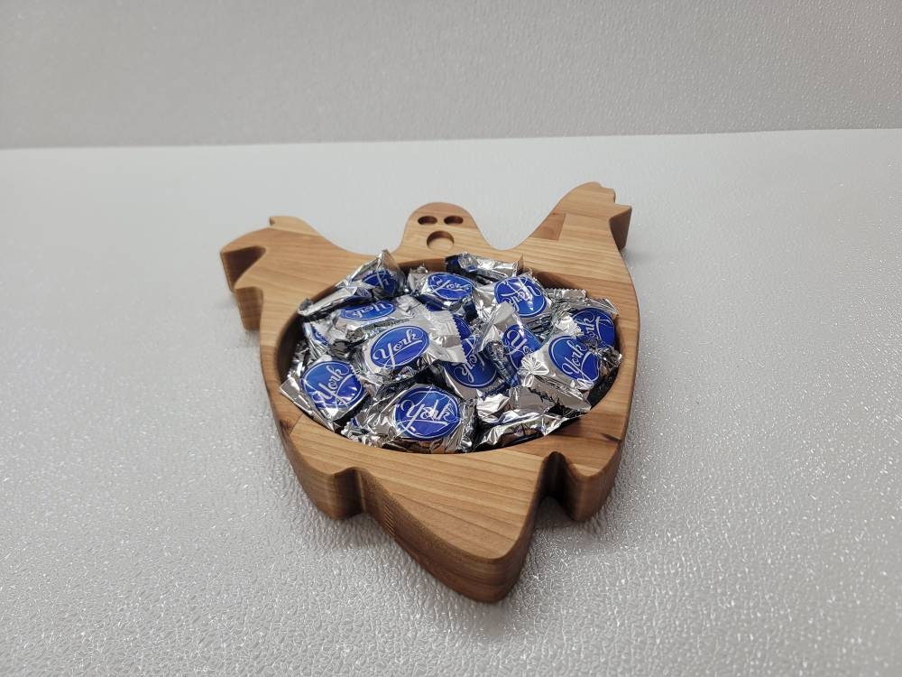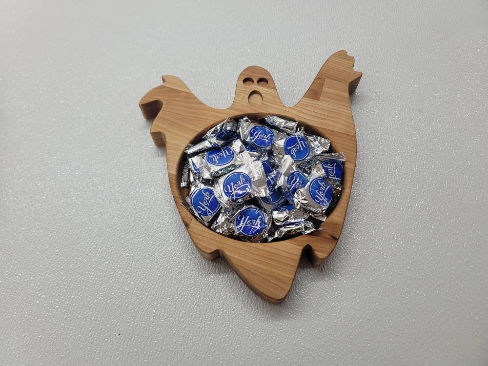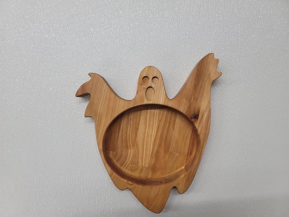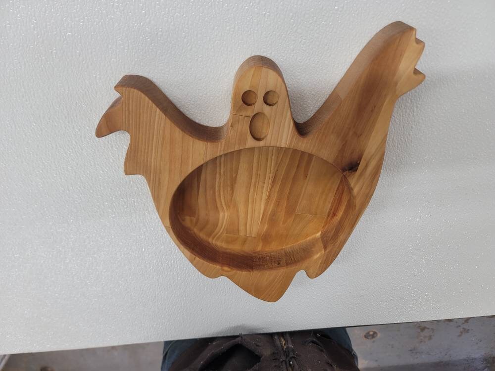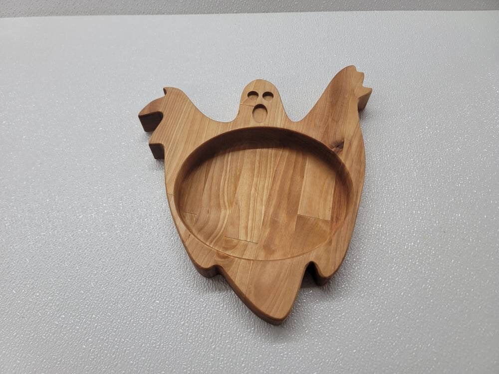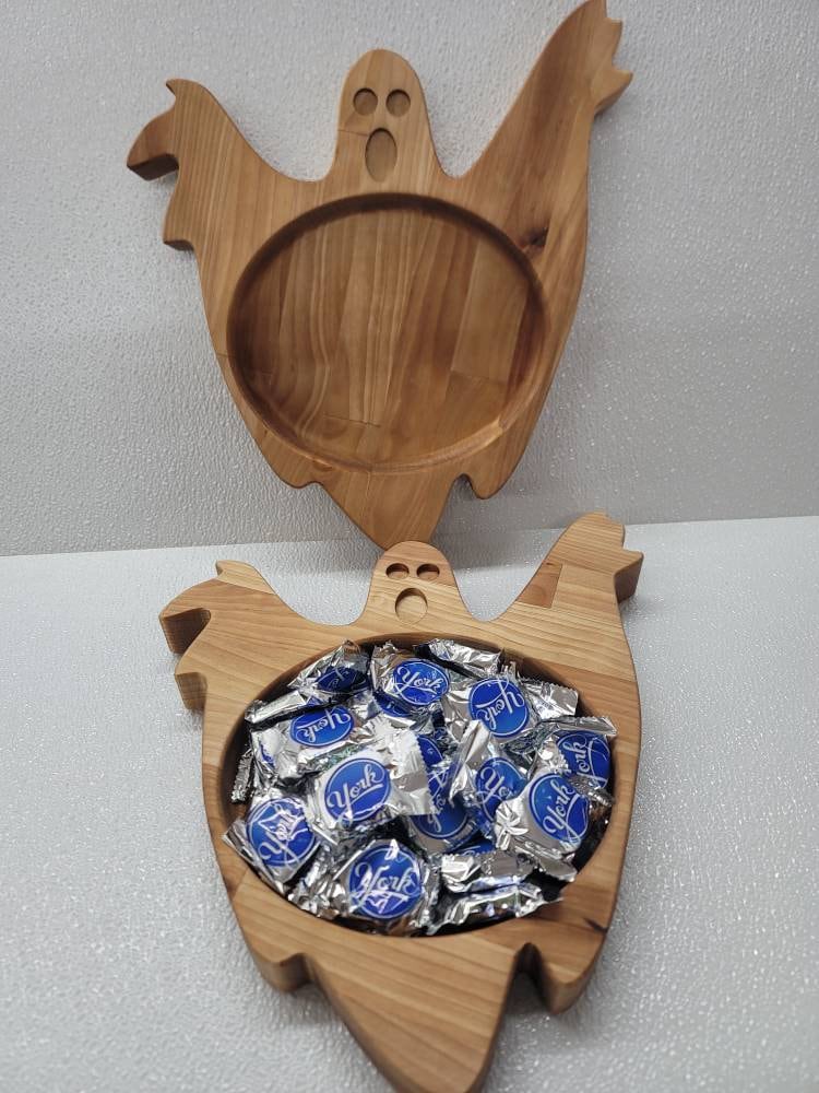 These hardwood snack dishes shaped like a ghost are great for any occasion. Snacks, treats, catch-all, all kinds of uses. There are finished can I butcher block conditioner that is food safe for all of your snacks . These are solid hardwood.